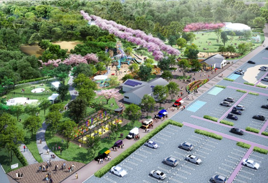 ・サービスセンター、トイレ棟、大型複合遊具などのデザインのほか、各公園施設(休憩施設・照明・サイン・園路舗装等)の設計・施工