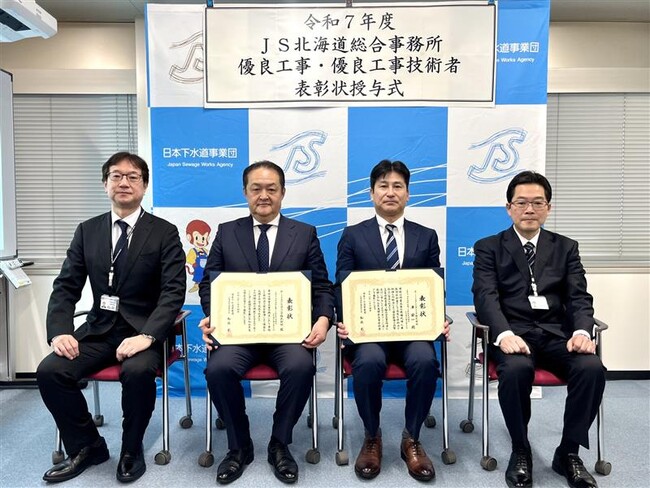 都港区)は1月14日、日本下水道事業団(以下JS)北海道総合事務所より、令和7年度「優良工事」ならびに「優良工事技術者」として選定、表彰されたことをお知らせします。