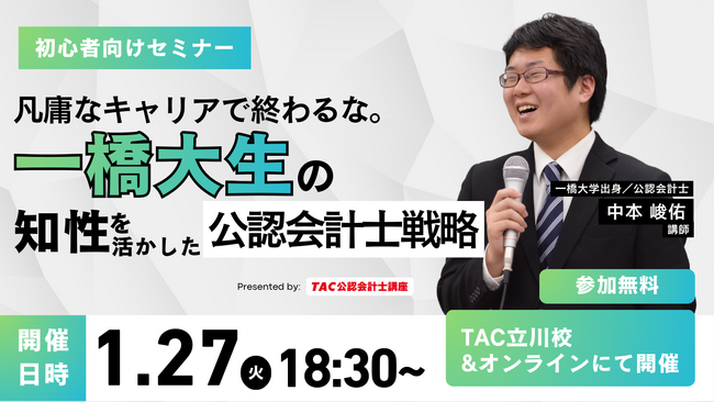 【資格の学校TAC】1/27(火)18:30~「凡庸なキャリアで終わるな。一橋大生の知性を最大限に活かす公認会計士戦略」《無料オンラインセミナー》