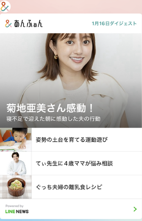 LINEニュースには「&あんふぁん」編集部によるインタビュー記事、専門ライターが書くファミリー向けのニュース、著名人や専門家による人気コラムなどを一挙に配信!身近でおトク、気付きのある記事がいっぱいです。