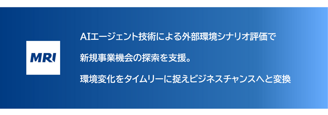 株式会社三菱総合研究所(代表取締役社長執行役員:籔田健二、以下 MRI)は、1月20日から、AIエージェントを活用した企業の新規事業機会の探索支援サービスの提供を開始します。MRIの豊富な経営インテリジェンスノウハウを組み込んだAIエージェントが企業の事業を取り巻く環境の将来シナリオを作成し、そのシナリオと実際の状況との間の乖離状況と具体的な動向を継続的に評価することで事業機会の可能性を具体的に提示します。AIならではの網羅的な情報収集・分析・評価力により、企業が環境変化を的確に捉えタイムリーに事業機会に変えることを支援します。