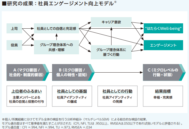 また、人的資本戦略の重要モニタリング指標である社員の「エンゲージメント」について、過去のエンゲージメントサーベイ結果のデータを用いて、それがどのようなメカニズムで高まるのか研究し、「社員エンゲージメント向上モデル」を新たに構築しました。社員のエンゲージメントや“はたらくWell-being”向上の施策検討において活用していきます。