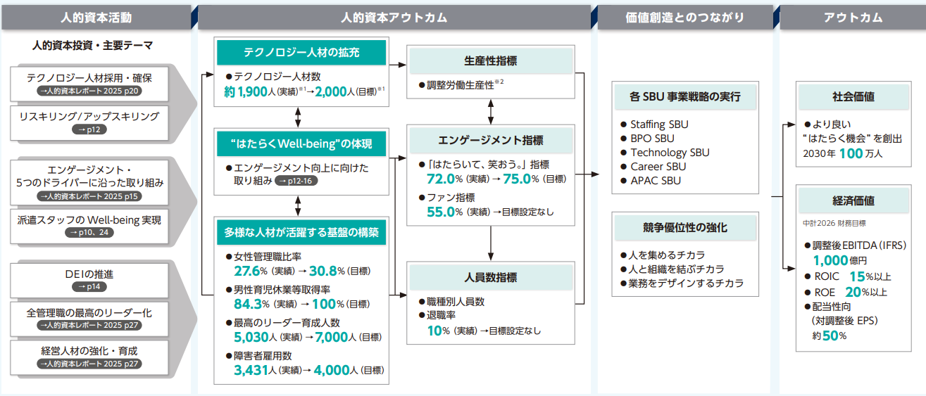 パーソルグループは「パーソルグループ中期経営計画2026」に基づき人的資本投資を進めており、この投資と2030年の価値創造(アウトカム)の関連を「人的資本インパクトパス」として2024年度に可視化しました。今年度のレポートでは、人的資本戦略の主要なKPIの進捗状況を伝えています。