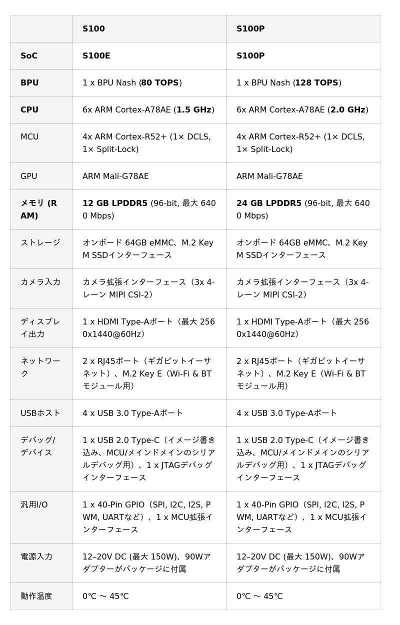 ラインナップは、BPU 80 TOPSの計算能力を誇る標準モデル「RDK S100」と、シリーズ最高性能モデル「RDK S100P」の2種類。S100Pは、最大128 TOPSのBPU演算性能に加え、2.0 GHzの高速CPU、24 GBの大容量LPDDR5メモリを搭載しており、より高度で複雑なリアルワールドのタスク処理に最適です。