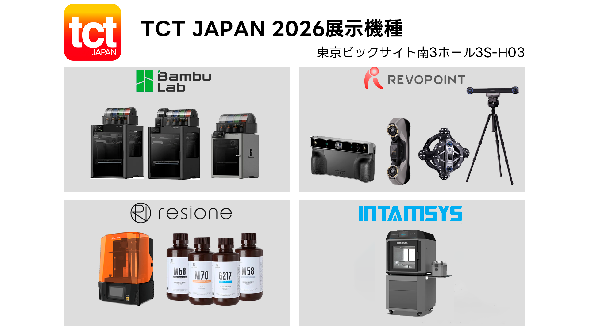 BambuLab / REVOPOINT / RESIONE / INTAMSYS の4ブランドをそれぞれ専用ゾーンに分け、最新機種・材料・実演展示を通じて、設計・試作・量産・最終製品製造までの幅広いソリューションをご提案いたします。
