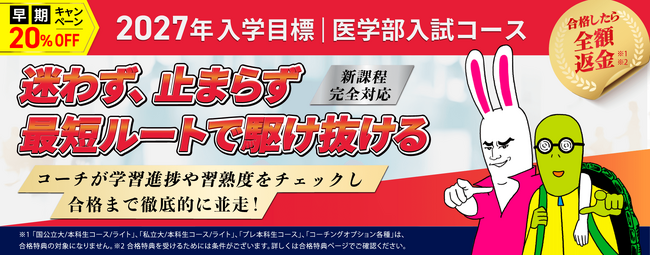 2027年入学目標 医学部入試コース(国公立大学・私立大学入試)をお申込みいただいた方が2027年の医学部入試に合格された場合、合格特典(全額返金)がございます。