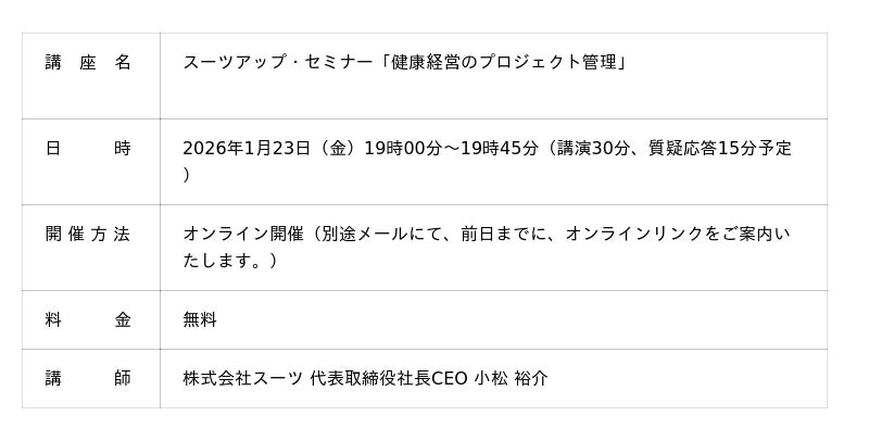 当社では、2026年1月23日(金)19時から、当社代表の小松が講師を務めるスーツアップ・セミナー「健康経営のプロジェクト管理」を無料開催します。