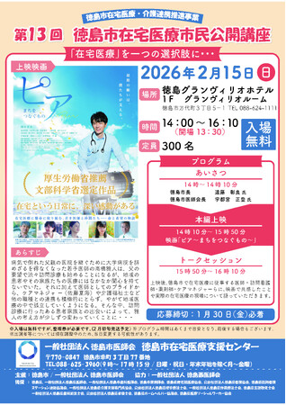 徳島市では、「徳島市在宅医療・介護連携推進事業」の一環として、徳島市民の皆さんに在宅医療を身近に感じていただき、今後の選択肢の一つとしていただくことを目的に「在宅医療市民公開講座」を開催します。