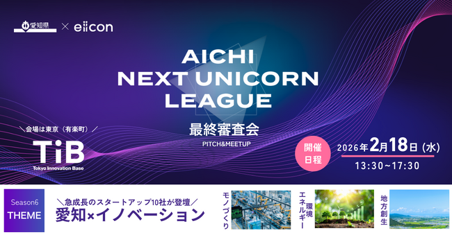 Tokyo Innovation Base(TiB:東京 有楽町) にて最終審査会開催 愛知県 × eiicon ビジネスプランコンテスト『AICHI NEXT UNICORN LEAGUE』 Season 6 テーマ「愛知×イノベーション」(2月18日(水)13:30~)