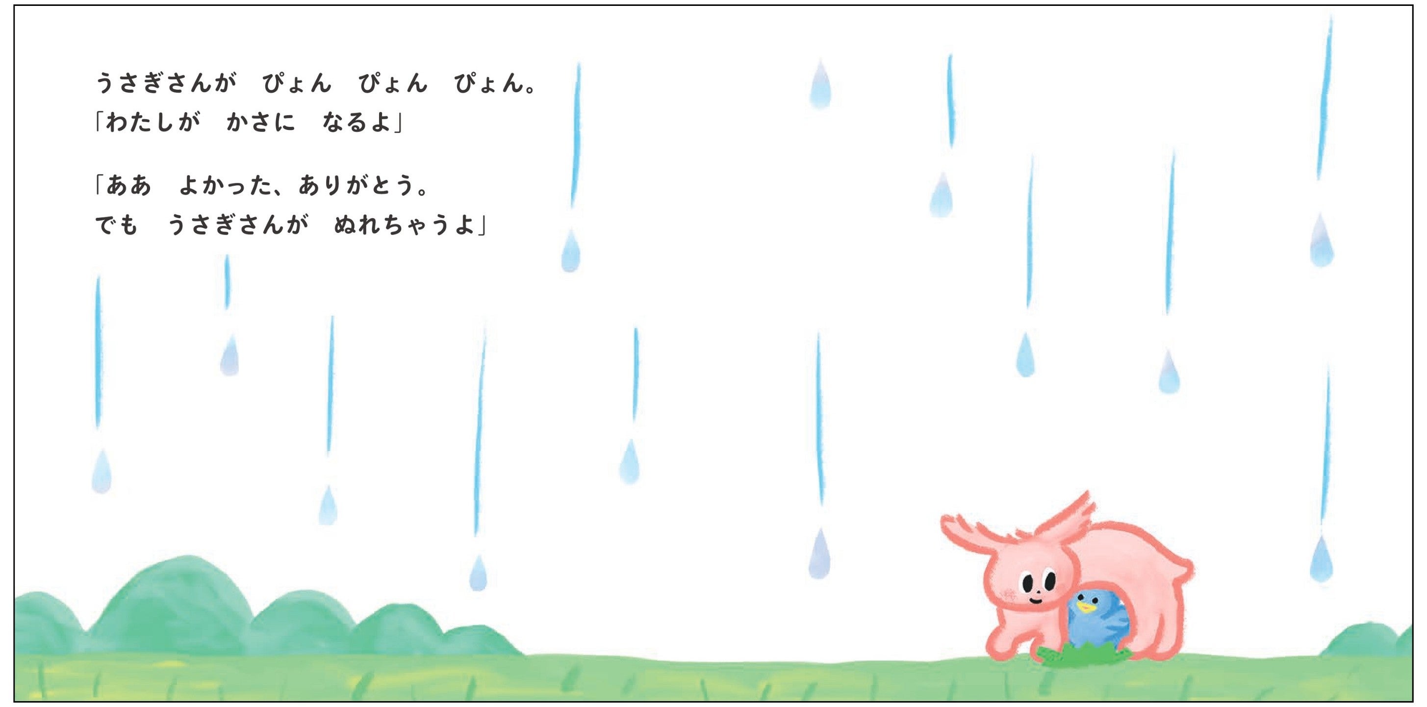 雨の中、とりさんがぬれながら、ぽつんと座っています。そこへ、やってきたのはうさぎさん。「わたしがかさになるよ」と、とりさんの上に重なって雨から守ります。