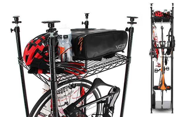「DDS630-BK」は、縦方向の空間を活かして自転車とギアをまとめて収納できるラックです。