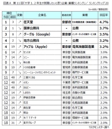・調査名称 : 第11回「大学1、2年生が就職したいと思う企業・業種ランキング」調査・調査方法 : インターネット調査