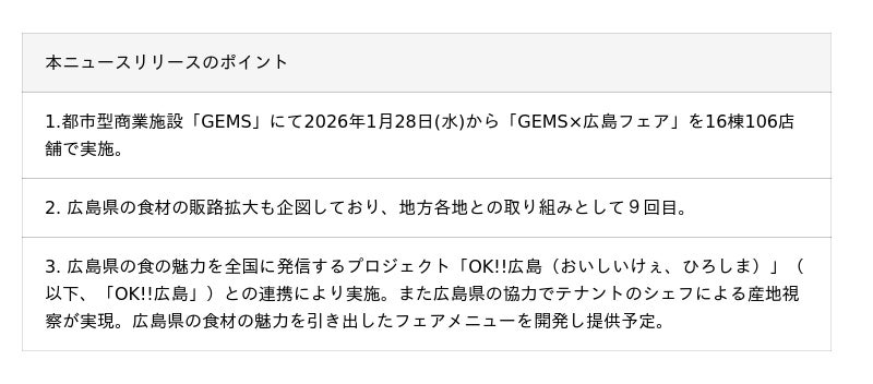 野村不動産コマース株式会社(東京都港区/代表取締役社長:鵜沼孝之)は、広島県の食の魅力を全国に発信するプロジェクト「OK!!広島(おいしいけぇ、ひろしま)」との連携により、飲食店に特化した都市型商業施設「GEMS(ジェムズ)」16棟、計106店舗において、食べて地方創生第9弾「GEMS×広島フェア」を1月28日(水)から2月17日(火)の期間で開催することをお知らせいたします。GEMSにおける地方食材を使った食材を活用した独自のフェアメニューを提供するほか、第一次産業に携わる方々を支援することによる地方創生の取組みでもあります。