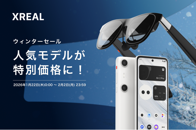AR(拡張現実)グラスを開発・販売しているXREALは2026年1月22日(木) 0:00 ~ 2026年2月2日(月)23:59の期間限定で、XREALが提供する次世代ARグラス「XREAL One」をはじめとしたXREAL製品をお得に購入できる「XREAL ウィンターセール」を開催いたします。この機会にぜひご検討ください。