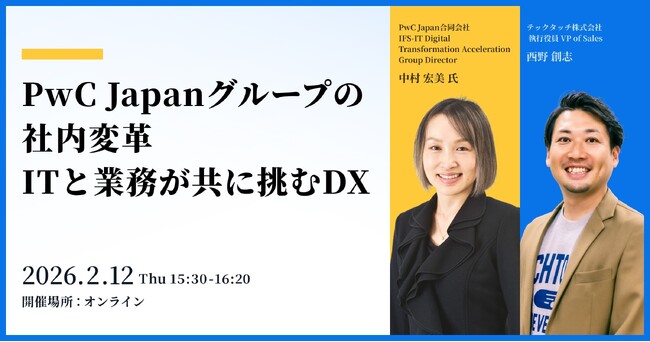 テックタッチ株式会社は、PwC Japan合同会社をゲストに招き、2026年2月12日(木) 15:30から無料オンラインセミナーを開催します。