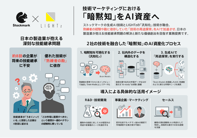 国産生成AI基盤の独自開発や生成AIサービスを提供するストックマーク株式会社(本社:東京都港区、代表取締役CEO:林 達、以下「当社」)は、熟練者の暗黙知の可視化、AI化技術(「汎知化(R)」)を持つ株式会社LIGHTz(本社:茨城県つくば市、代表取締役社長CEO:乙部 信吾、以下「LIGHTz社」)と、製造業の技術マーケティング/新規用途探索領域におけるソリューション強化を目指した業務提携を開始いたしました。