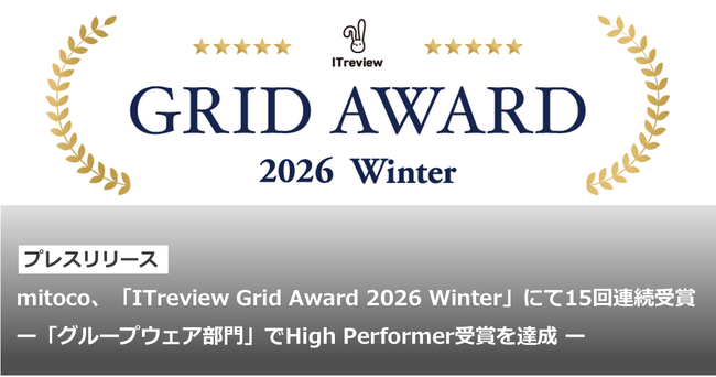 株式会社テラスカイ(本社所在地:東京都中央区 、代表取締役CEO 社長執行役員:佐藤 秀哉、以下テラスカイ)が提供するグループウェアmitoco(ミトコ)は、アイティクラウド株式会社(本社所在地:東京都港区、代表取締役社長 兼 CEO:黒野 源太、以下アイティクラウド)主催の「ITreview Grid Award 2026 Winter」において、グループウェア部門で「High Performer」を受賞いたしました。グループウェア部門での受賞は「ITreview Grid Award 2022 Summer」以来、15回連続となります。