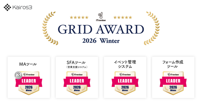 この度、当社が提供するMA+SFA一体型ツール「Kairos3」は、2026年1月に発表された「ITreview Grid Award 2026 Winter」において、ITreviewに集まった約15.1万件のレビューをもとに、顧客満足度と認知度の双方が優れた製品に贈られる「Leader」を4部門にて受賞しました。