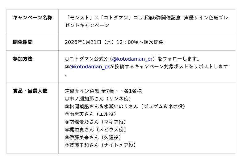 キャンペーンの応募規約・参加条件・賞品などの詳細は、コトダマン公式お知らせをご確認ください。