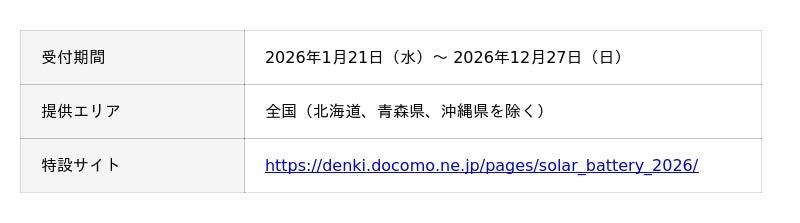 本提携により、3社は各社の強みを融合した「制御機能付き家庭用蓄電池」の提供(以下、本取り組み)を開始いたします。本取り組みでは、ELJ が持つ豊富な販売・施工実績と、スマイルエナジーが提供する蓄電池制御プラットフォーム※1 、ドコモの顧客基盤を活かして、ドコモが窓口となってお客さまへ安心かつ最適な蓄電池導入をご紹介します。 先行受付の期間は、2026年1月21日(水)から 2026年12月27日(日)です。お申込みいただいた お客さまには、ご自宅訪問による無料相談や現地調査を実施し、最適な蓄電池や太陽光発電の設置をご提案します。