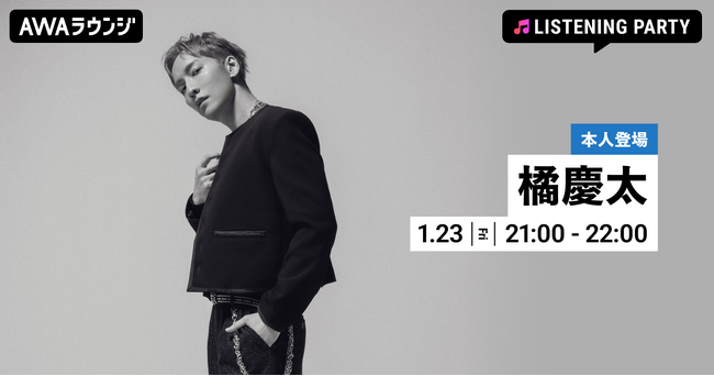 AWA株式会社(本社:東京都港区、代表取締役CEO:冨樫晃己)が運営する、サブスクリプション型(定額制)音楽ストリーミングサービス「AWA(アワ)」は、2026年1月23日(金) 21:00~22:00にて、無料で誰でも参加できるオンライン空間「ラウンジ」で、橘慶太が音声とチャットで登場するリスニングパーティーを開催いたします。