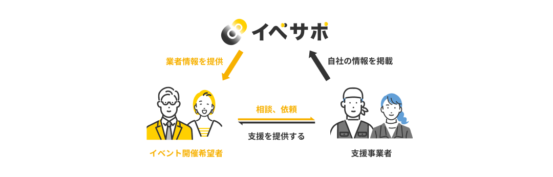 イベントの規模や目的に合わせて、主催者が必要な支援事業者を検索し、直接問い合わせができるオンラインマッチングプラットフォームです。支援事業者は初期費用・月額費用なく掲載でき、主催者は複数の事業者を比較しながら選択できます。双方にとって情報の非対称性をなくし、公平で透明性の高いマッチングを実現するサービスです。