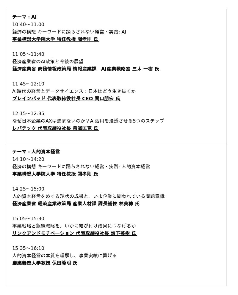 本セミナーでは、「AI」「人的資本経営」「成長戦略」「探究学習」をテーマに掲げ、企業・自治体・