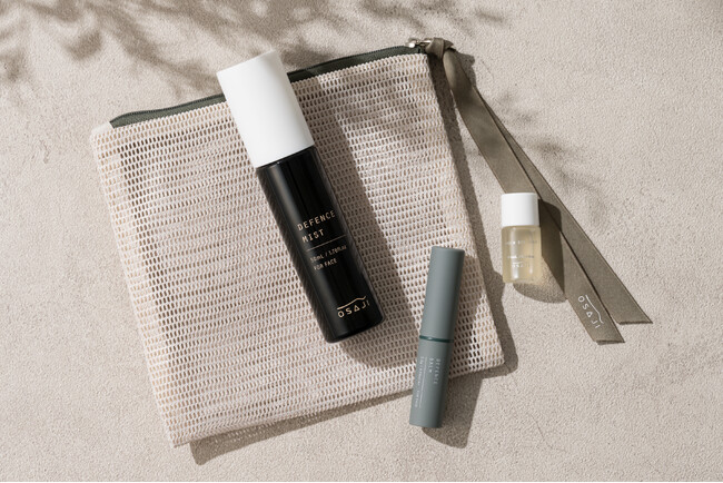 花粉や大気汚染物質から肌を守るディフェンスミスト・ディフェンスバームに、オリジナルメッシュポーチとOSAJIのベストセラー美容液を組み合わせた限定セットをご用意。
