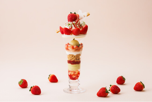 トップに添えたいちごで花びらが開く様子を視覚的に表現し、エルダーフラワーのジュレでマスカットのような爽やかな花の香りを加えました。パフェの中心部にはピスタチオのムースを組み合わせ、新緑を思わせる淡い緑色とナッツ特有の香ばしさで、大地から草木が芽吹く様子を表現しています。国産いちご本来の甘酸っぱい味わいに、花の香りとピスタチオのコクを重ねた、春の訪れを感じる一品をお楽しみください。