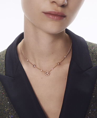 エネルギー、感動、調和を予感させる「ローズ デ ヴァン」のストーリーに新たに加わったのは、強さと静謐さを体現するオニキスをあしらった漆黒のクリエイションがモダンなネックレス、イヤリングとブレスレットです。「エトワール デ ヴァン」からは初となるホワイトゴールド モデルが登場し、ムッシュ ディオールのラッキーナンバーであった「8」へのオマージュである八芒星モチーフが普遍的で、一切の妥協を許さない自由なシルエットを描きます。ピンクゴールド、または、ホワイトゴールドにダイヤモンドをあしらったネックレスとブレスレットは、優美に揺らめく輝きの中で「ローズ デ ヴァン」と「エトワール デ ヴァン」を紡ぎます。そして、ヴィクトワール・ドゥ・カステラーヌも大切にしている、ムッシュ ディオールのラッキーチャームであるスズラン、ハート、バラ、スカル、アイビー、空を舞うハチが、彩り豊かに配されたロングネックレスが登場します。輝きとひとつひとつのチャームが宿す秘められたストーリーが一体となり、運命の神秘を信じたムッシュ ディオールと呼応した現代のタリスマンとして、遊び心に溢れたステートメント ジュエリーです。