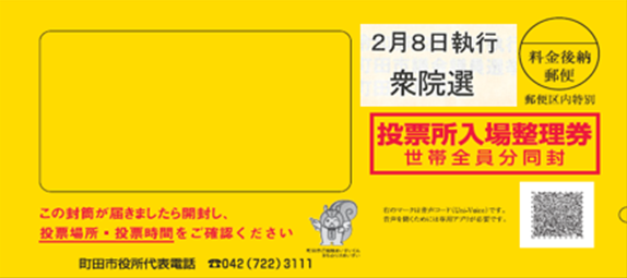 また、令和8年2月15日執行 町田市議会議員選挙・町田市長選挙の投票所入場整理券は、2月4日以降に白い封筒で送付します。