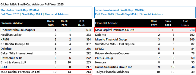 M&Aキャピタルパートナーズ株式会社(東京都中央区・代表取締役社長 中村悟、以降「MACP」)は、LSEG(ロンドン証券取引所グループ)データによる中規模市場M&Aリーグテーブル「Global M&A Mid-Market Advisory」「Global M&A Small-Cap Advisory」案件数ベースのランキングにおいて、「Worldwide Mid-Market/Small-Cap」で2年連続ランクインし、「Japan Involvement」において1位を獲得しましたので、お知らせいたします。