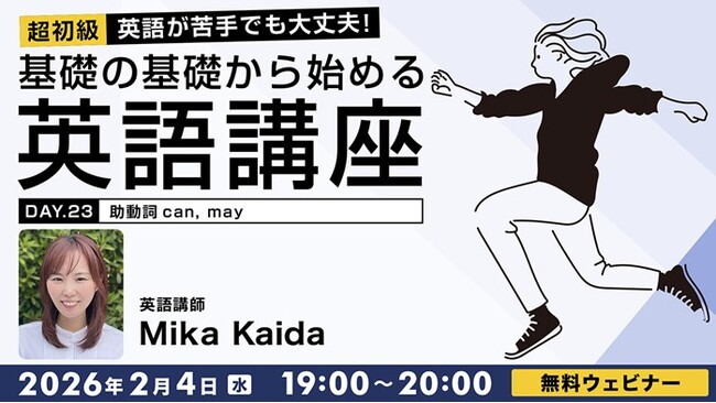 株式会社クリーク・アンド・リバー社(C&R社)は2026年2月4日(水)・25日(水)、英語が苦手な方や英語の基礎から学びたい方を対象に、無料のオンラインセミナー「【超初級】英語が苦手でも大丈夫!基礎の基礎から始める英語講座Day.23/Day.24」を開催します。