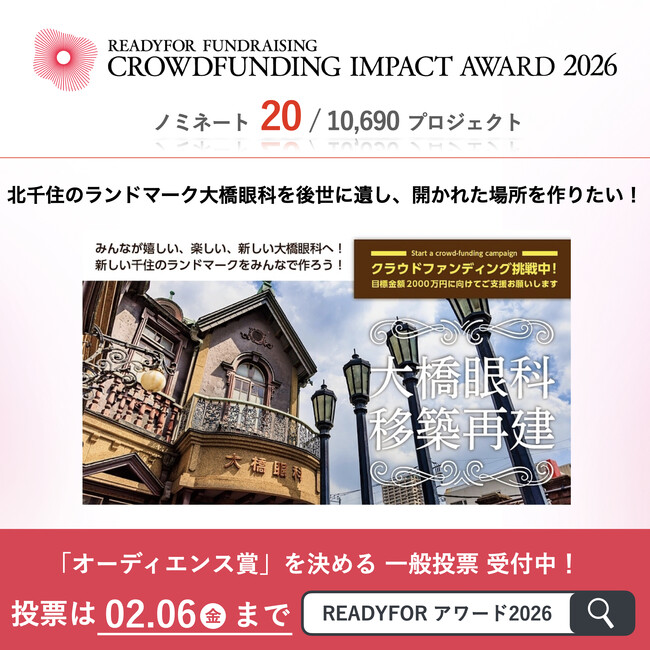 大橋眼科移築再建プロジェクト実行委員会(代表:阿部 朋孝)が実施したクラウドファンディング「北千住のランドマーク大橋眼科を後世に遺し、開かれた場所を作りたい!」が、クラウドファンディングサービスREADYFORが主催する「READYFORファンドレイジング クラウドファンディングインパクトアワード2026」にノミネートされました。