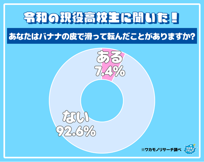 今回の調査の結果を見ていくと、7.4%の高校生が「滑って転んだことがある」と回答。1クラスを30人とすると、1クラスで2人程度の高校生がバナナの皮で滑って転んだことがある結果