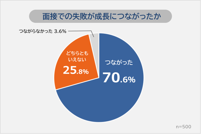 「面接での失敗が成長につながったか」を聞いたところ、「つながった(70.6%)」と回答した人が7割を超えました。