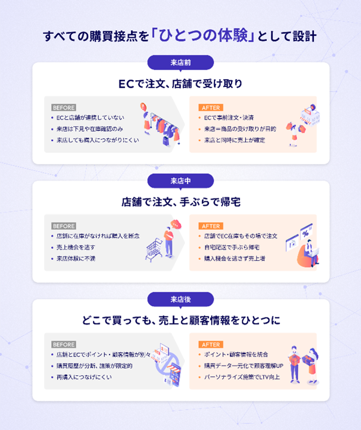 本パッケージにより、ECと店舗それぞれに分断されていた在庫、注文、ポイント、顧客データを横断的に統合し、来店前・来店中・来店後のすべての購買接点をひとつの体験として設計することが可能になります。