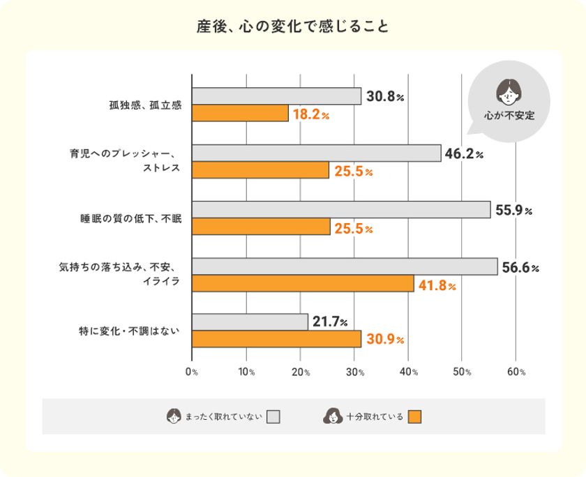 心の状態を比べると、自分時間が取れていないママは、「気分の落ち込み・不安・イライラ」(56.6%)や「睡眠の質の低下」(55.9%)、「孤独感」(30.8%)など、メンタルの不調を感じる割合が高いことが分かりました。