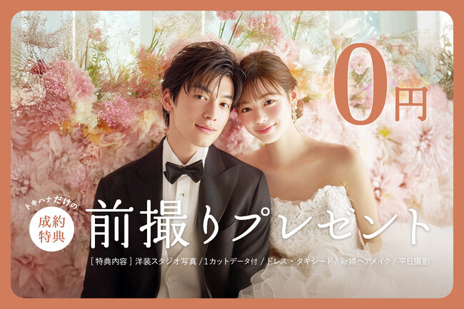 LINEでできる式場探し『トキハナ(https://tokihana.net/)』を運営する株式会社トキハナ(本社:東京都港区、代表取締役社長:安藤 正樹、以下「トキハナ」)は、トキハナ経由で結婚式場を成約された方全員を対象に、人気フォトスタジオでの前撮り撮影の基本料をプレゼントする特典の提供を開始しました。