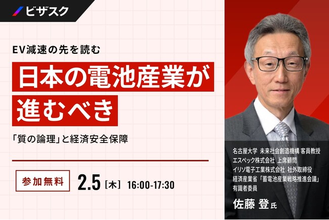 「知見と、挑戦をつなぐ」をミッションにグローバルなナレッジプラットフォームを運営する株式会社ビザスク(以下、当社)は、『日本の電池産業が進むべき「質の論理」と経済安全保障』をテーマに、名古屋大学 未来社会創造機構 客員教授、エスペック株式会社 上席顧問、イリソ電子工業株式会社 社外取締役、経済産業省「蓄電池産業戦略推進会議」有識者委員でもある 佐藤 登氏 ご登壇による無料オンラインセミナーを 2/5 (木) 16:00 より開催します。