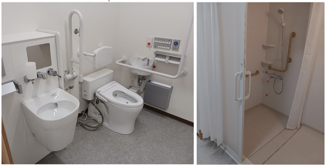 AARの支援によって整備されたバリアフリートイレ(左)と、入口に段差がなく車いすでも入りやすいシャワールーム=石川県七尾市の「LABO」で