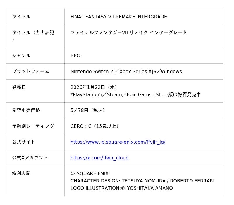 株式会社スクウェア・エニックス(本社:東京都新宿区、代表取締役社長:桐生 隆司、以下スクウェア・エニックス)は、Nintendo Switch 2 / Xbox Series X|S / Windows版『ファイナルファンタジーVII リメイク インターグレード』を本日発売したことをお知らせいたします。