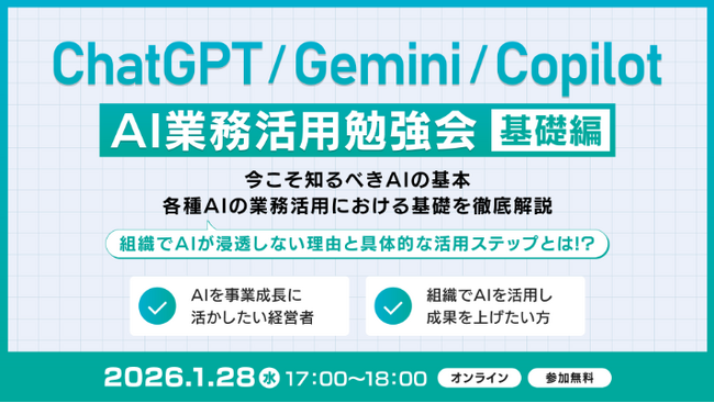 ChatGPTなどの基礎から、具体的なビジネス活用事例までを分かりやすく解説する勉強会を開催します。すでに400人以上が受講し、その効果を実感しています。ChatGPTなどの生成AIをビジネスのインフラとして活用し、業務効率化を図りたい方は、ぜひご参加ください。