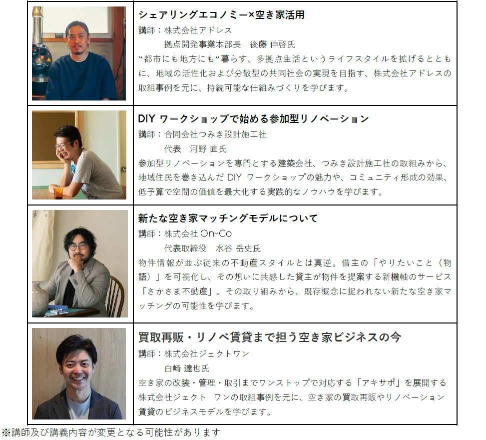 ・講座名:さとのば大学マイフィールドコース 空き家活用オプション講座・受講期間:前期:令和8年4月~令和8年7月