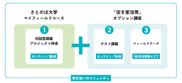 本プログラムは、さとのば大学「マイフィールドコース」のオプショナル講座として開講し、体系的な「オンライン講義・伴走サポート」に加えて、「空き家活用」に特化した特別講義およびフィールドワークを提供します。[画像2: https://prcdn.freetls.fastly.net/release_image/33058/799/33058-799-fd7e1e374ba7488084a1f57078e306bb-602x275.png?width=536&quality=85%2C75&format=jpeg&auto=webp&fit=bounds&bg-color=fff ]