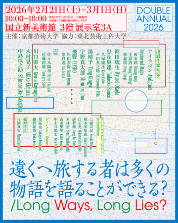 京都芸術大学(京都市左京区/学長 佐藤 卓)と東北芸術工科大学(山形市上桜田/学長 中山ダイスケ)は、学生選抜展「DOUBLE ANNUAL2026 ――遠くへ旅する者は多くの物語を語ることができる?/Long Ways, Long Lies?」を2026年2月21日(土)~3月1日(日)に国立新美術館で開催します。本展は、堤拓也・慶野結香の2名のディレクターと、監修に片岡真実(森美術館館長)を迎え、展覧会をつくりあげます。