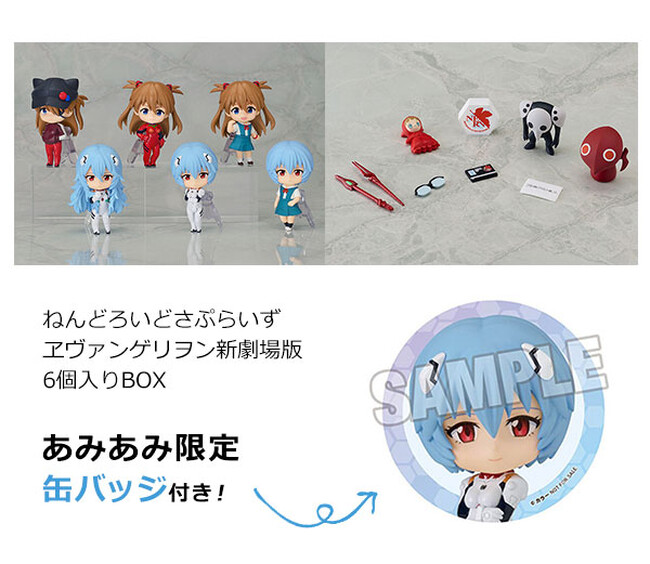 大網株式会社(本社・東京都文京区)が運営するホビー通販大手「あみあみ」では、「グッドスマイルカンパニー」より、『ねんどろいどさぷらいず ヱヴァンゲリヲン新劇場版 6個入りBOX』を、あみあみ限定特典「缶バッジ(仕様:直径65mm)」付きで、現在ご案内中です。