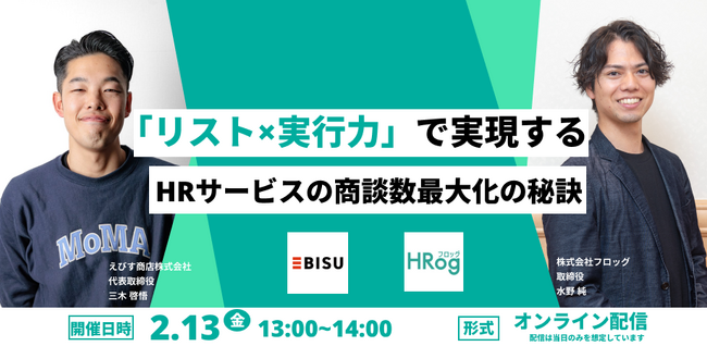 分析用求人ビッグデータを提供する株式会社フロッグ(所在地:東京都千代田区、代表取締役:阪野 香子、以下「当社」)は、えびす商店株式会社と共催で、2026年2月13日(金)にオンラインセミナー「『リスト×実行力』で実現する、HRサービスの商談最大化の秘訣」を開催いたします。