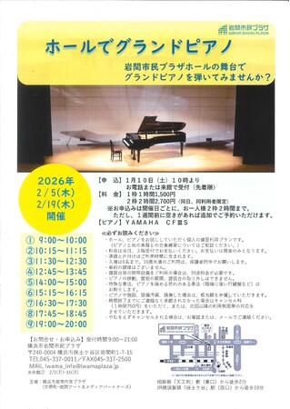 【横浜市岩間市民プラザ】ホールでグランドピアノ