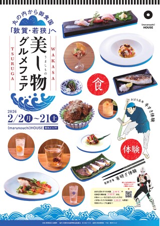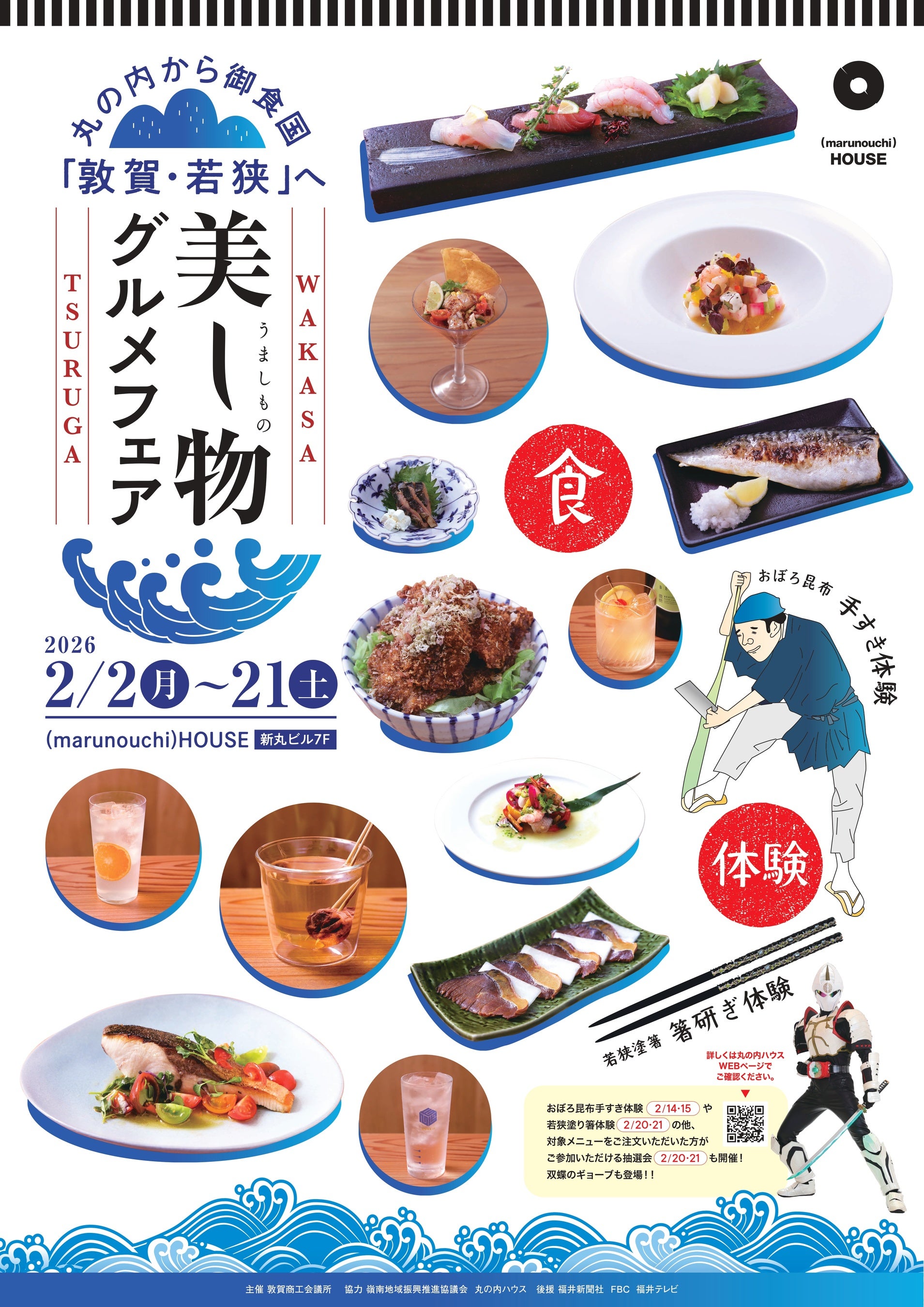 新丸ビル7階「丸の内ハウス」は、福井県の敦賀(つるが)・若狭(わかさ)地域の食材を使ったオリジナルメニューを、フロア内の飲食店全12店舗で提供する『丸の内から御食国「敦賀・若狭」へ 美し物-うましもの-グルメフェア』を2月2日(月)より開催します。